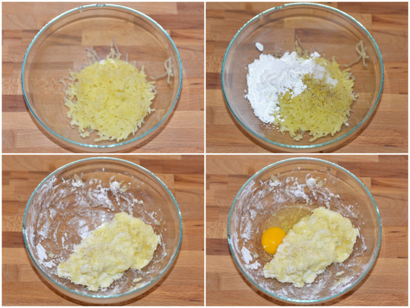 Schiacciate le patate con uno schiacciapatate o un passaverdure, quindi unite maizena, sale e pepe e mescolate, poi incorporate anche l'uovo.