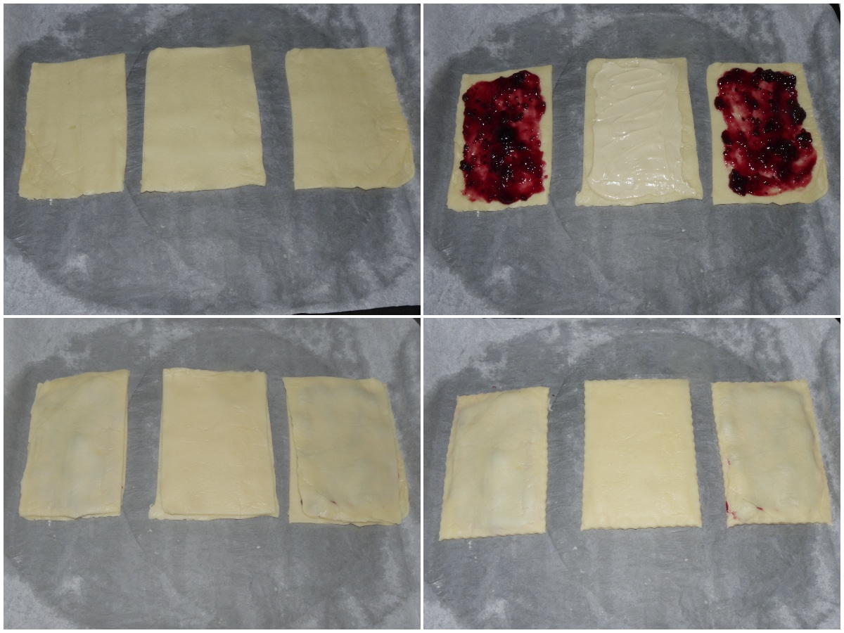 Disponete metà dei rettangoli sulla teglia del forno rivestita di carta forno, farcite con la marmellata (in uno io ho provato a mettere cioccolato bianco fuso) lasciando i bordi liberi, quindi coprite con i rettandoli rimasti, sigillate i bordi, spennellate con poco latte e cuocete per 10-15 minuti a 180°C, in forno ventilato già caldo, poi lasciateli raffreddare.