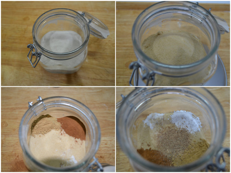 Prendete il vasetto ben sterilizzato e mettete, a strati: farina, zucchero, aromi, sale e lievito.