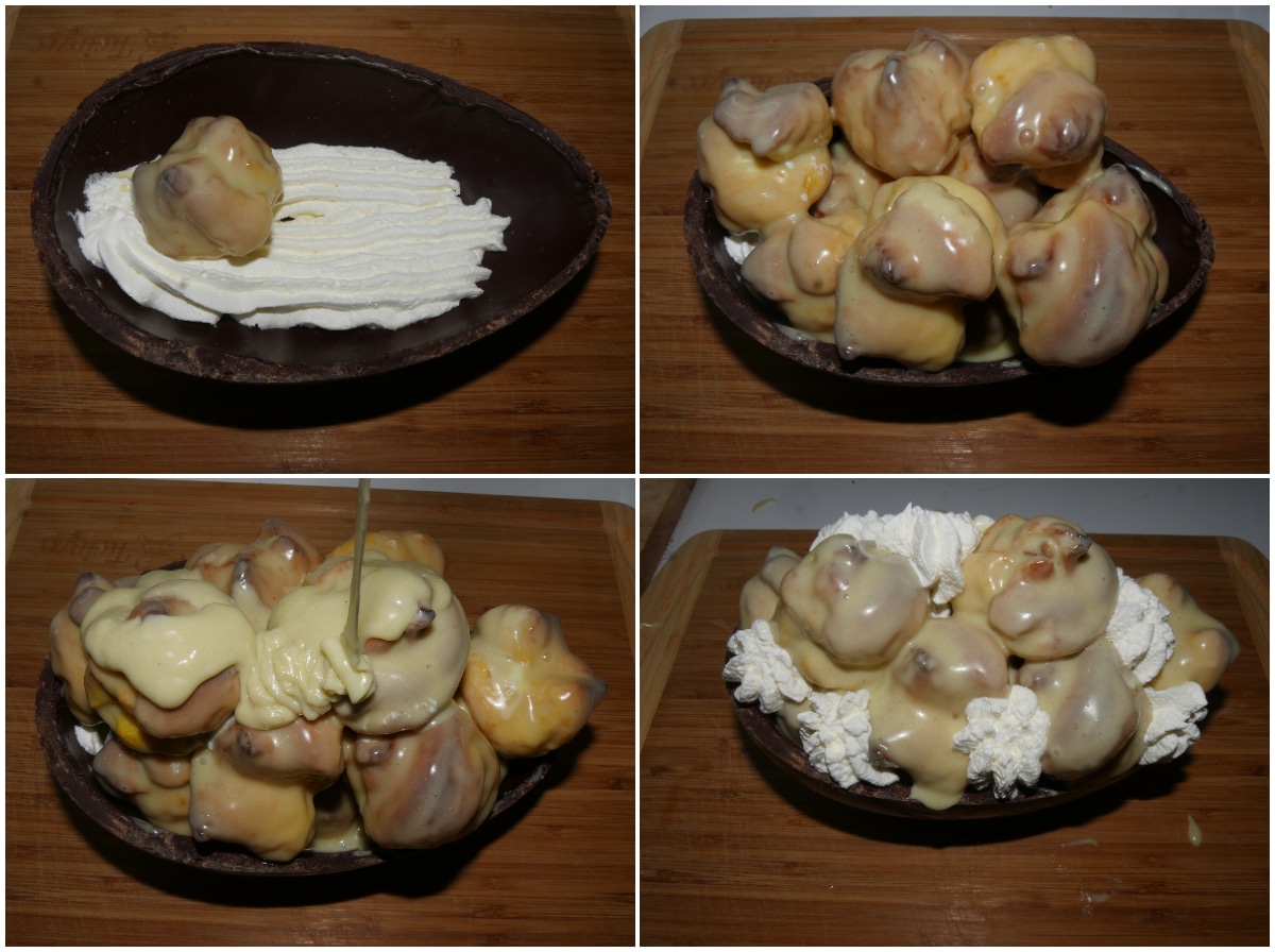 Assemblate il dolce: create uno strato di panna montata sul fondo dell'uovo, quindi riempitelo tutto con i bignè glassati.