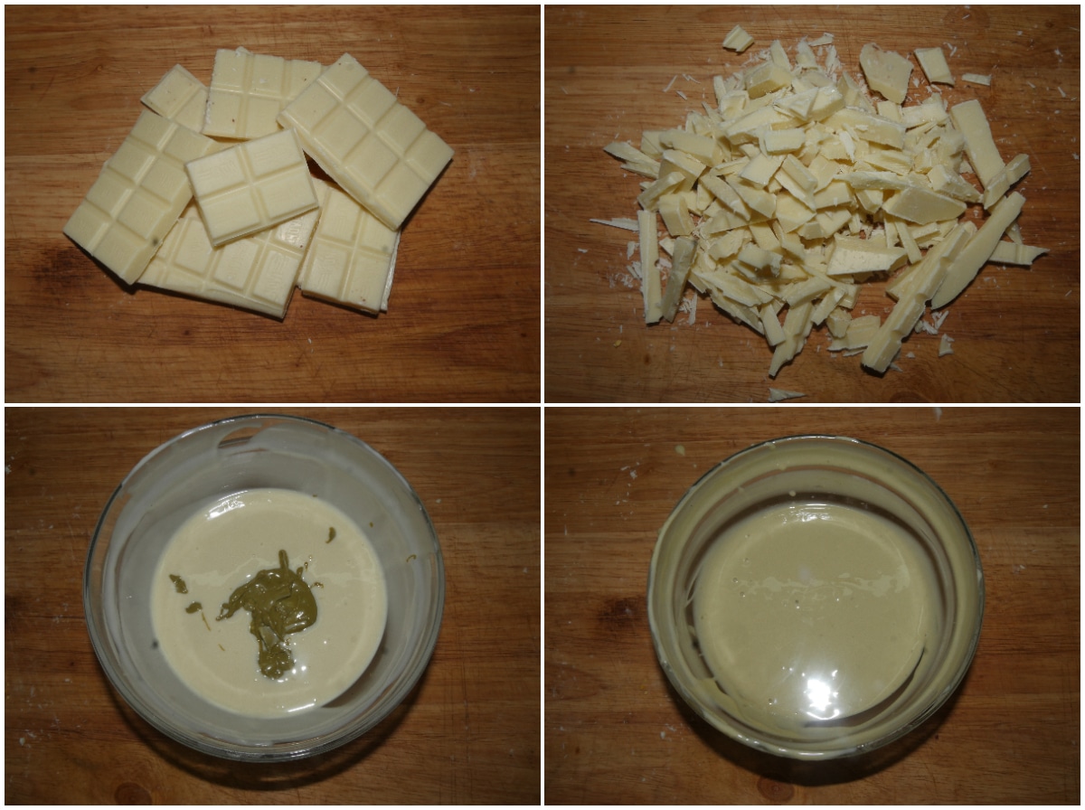 Preparate la glassa: spezzettate il cioccolato e scioglietelo in microonde (o a bagnomaria), quindi incorporatevi la pasta di pistacchio (se non l'avete trovata già pronta potete farla in casa con pistacchi, zucchero e un pochino di latte, come spiegato in questa ricetta).
