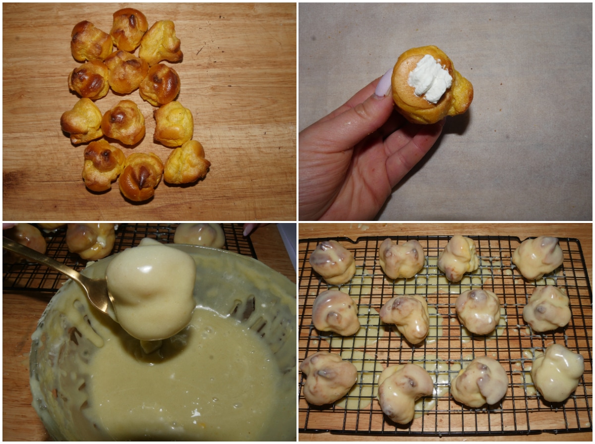 Trasferite la panna in una sac-à-poche con il beccuccio a stella (così lo sfrutterete anche dopo per i decori) e riempite i bignè, quindi passateli nella glassa.