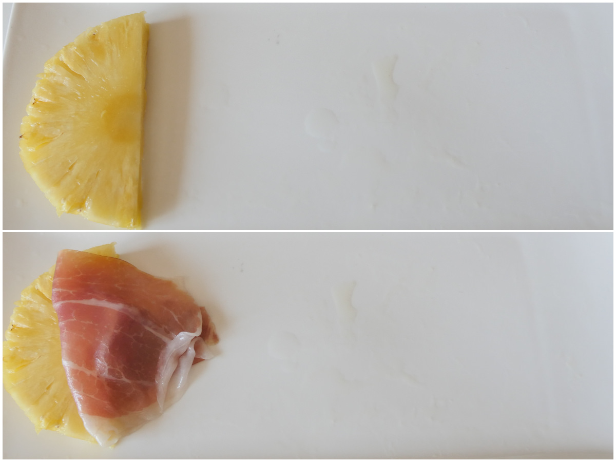Oggi, più che una ricetta vi propongo un'idea, è Ferragosto e non mi va di accendere i fornelli. Prosciutto e ananas è un abbinamento forse un po' insolito ma a mio avviso molto ben riuscito che ho provato di recente. Si tratta di un piatto freddo, veloce da preparare e molto saporito, perfetto sia per l'estate che per l'inverno. La dolcezza e la freschezza dell'ananas si sposano benissimo con la sapidità del prosciutto, soprattutto se ne userete uno dolce il contrasto sarà perfetto. Il procedimento è rapidissimo e l'unica parte scocciante sarà la pulizia dell'ananas, quindi che aspettate?