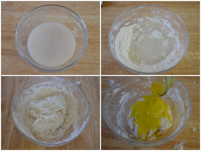 Mettete le frina a fontana in una ciotola, aggiungete il lievito e impastate. Infine unite anche l'acqua restante, il sale e l'olio e continuate a lavorare fino ad ottenere un impasto liscio ed omogeneo.