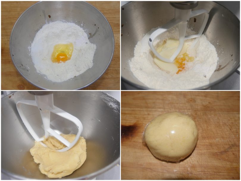 Impastare velocemente tutti gli ingredienti fino a ottenere una panetto morbido e compatto che avvolgerete in una pellicola trasparente e metterete a riposare in frigo per mezzora.