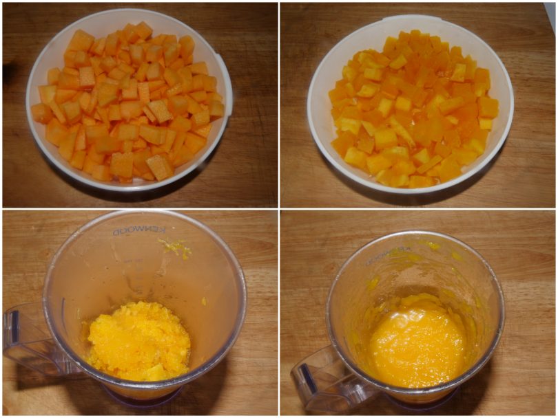 Pulite la zucca eliminando i semi, i filamenti e la buccia, prendete la polpa (che dovrà pesare 400 gr), tagliatela a pezzi e cuocetela a vapore per 15 minuti o in alternativa in forno per 20 minuti.