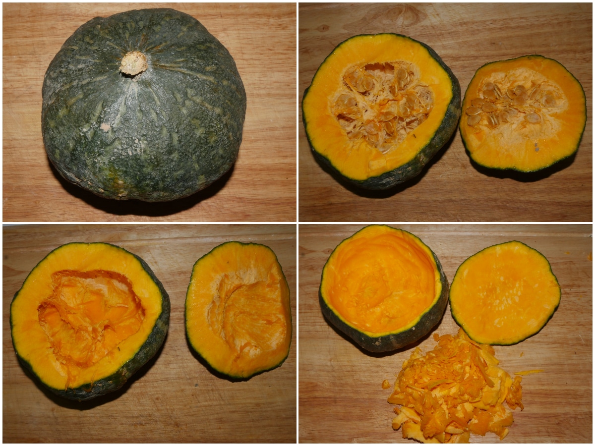 Innanzitutto lavate bene la zucca, quindi tagliate via la calotta, eliminate i semi e poi scavate via la polpa, lasciando un guscio di buccia di zucca di circa 1-2 cm.