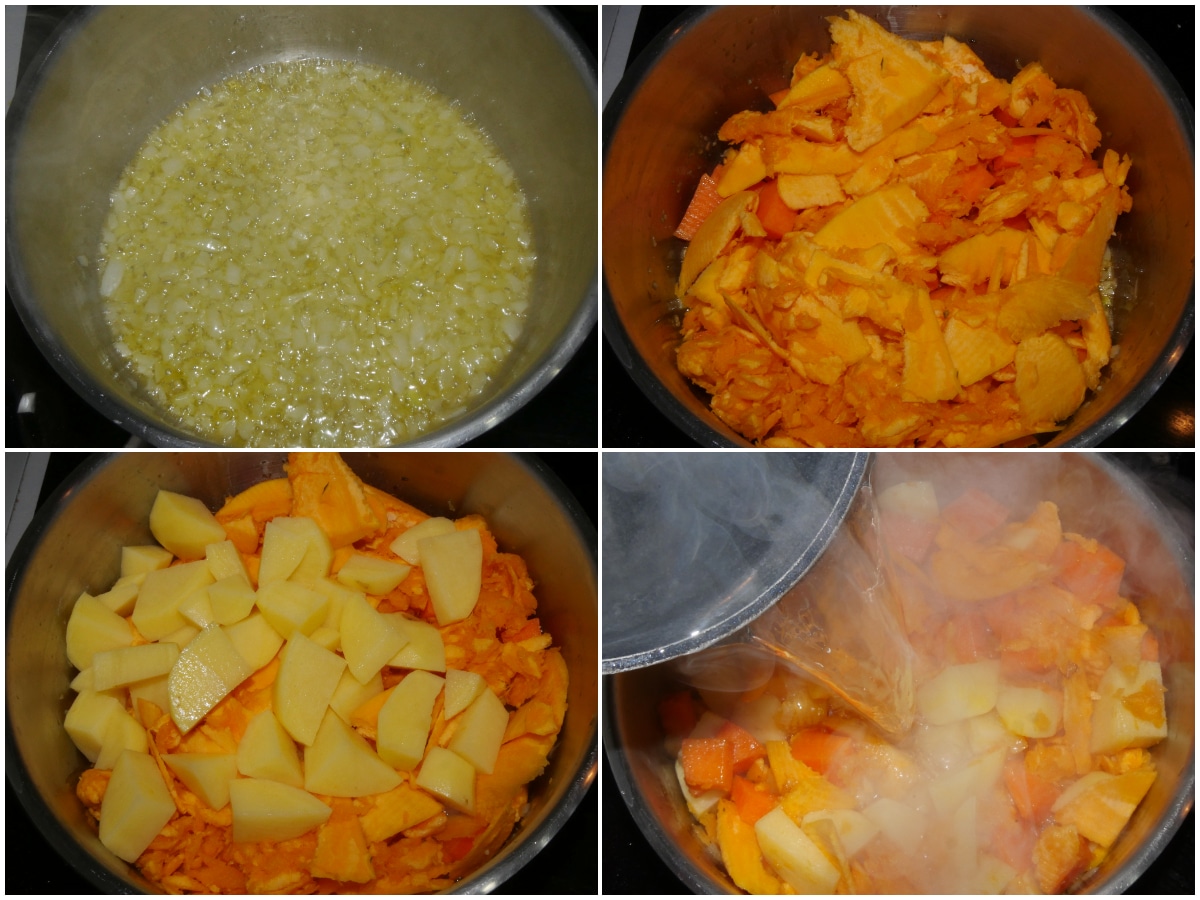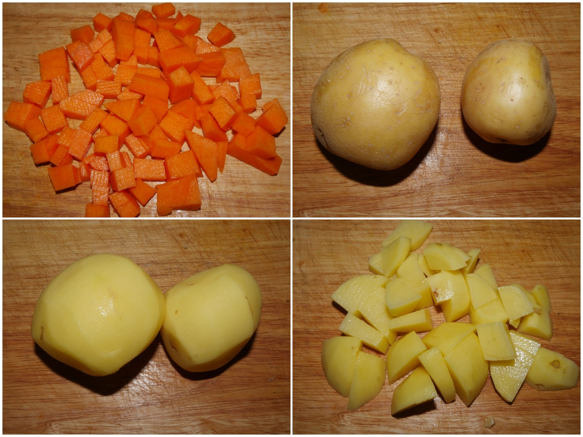 Pelate e lavate le patate, poi tagliate zucca e patate a dadini.