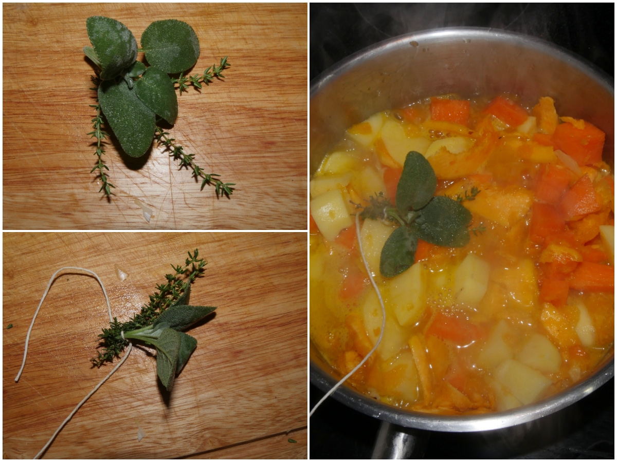 Aggiungete zucca e patate, coprite con il brodo, aggiungete timo e salvia, coprite con un coperchio e cuocete per circa 15-20 minuti.