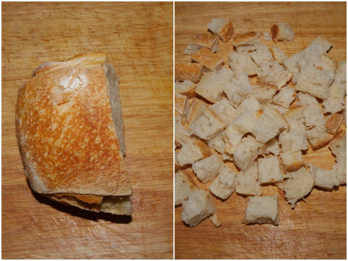 Nel frattempo, tagliate il pane a fette e poi a dadini.
