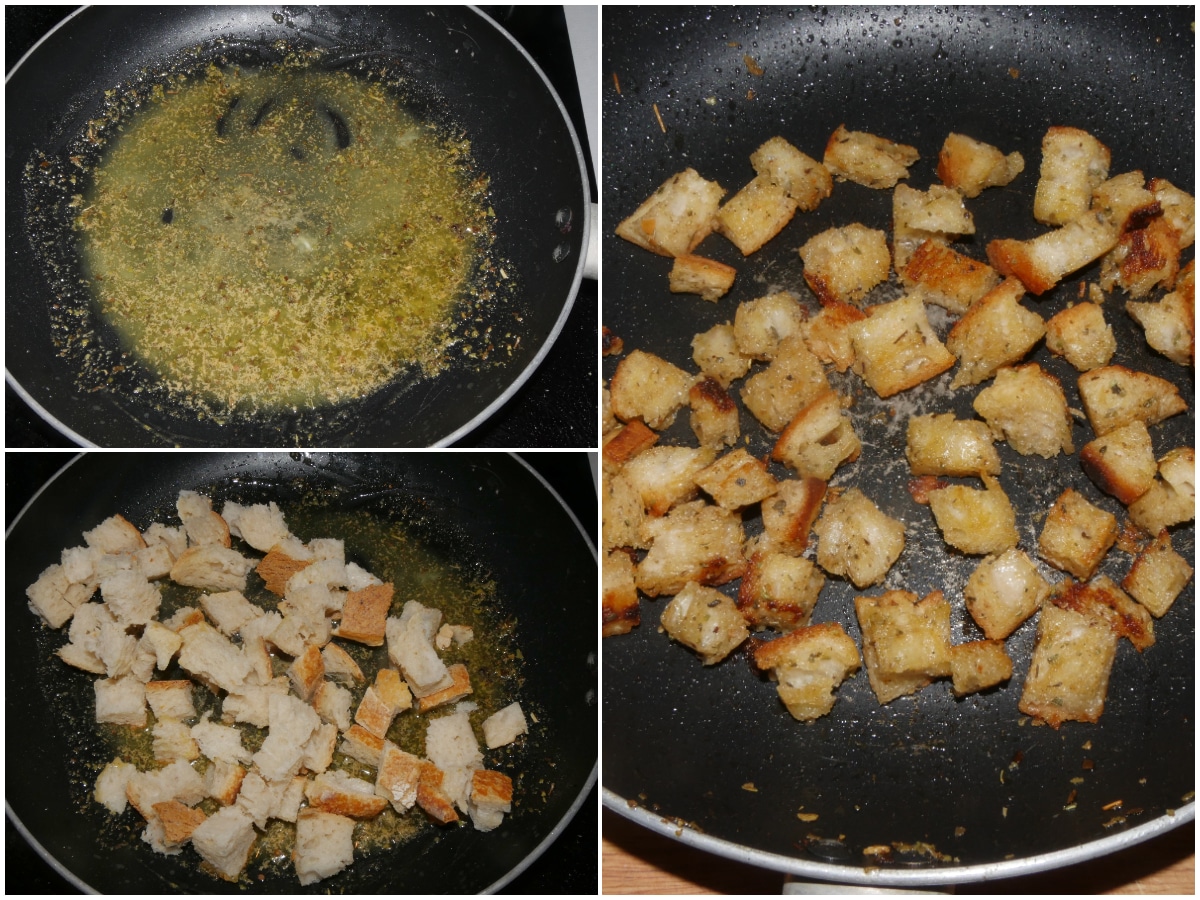 Fate sciogliere il burro restante in una padella insieme con un po' di salvia tritata, un filo d'olio e un pizzico di sale, aggiungete il pane, mescolate per far assorbire tutto il condimento e lasciate dorare il pane, mescolando spesso per creare una doratura uniforme.