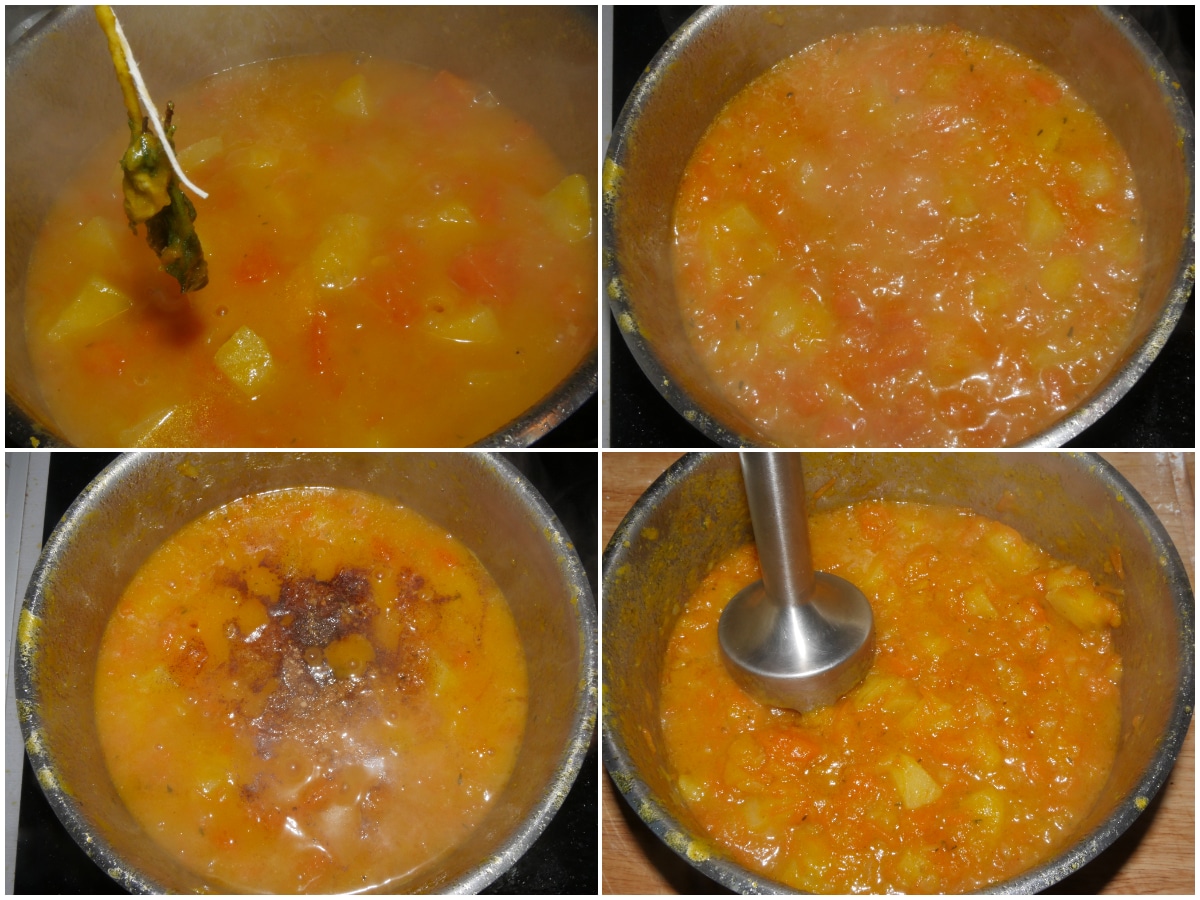 Quando zucca e patate saranno pronte, eliminate i rametti di aromi, aggiungete sale, pepe, cannella e noce moscata e frullate fino ad ottenere una consistenza liscia e vellutata.
