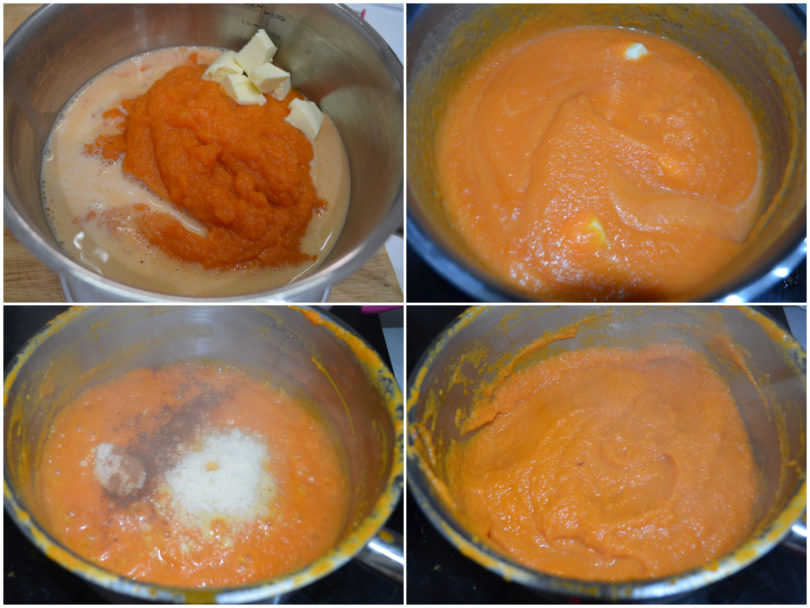 Mettete la polpa in un pentolino insieme con latte (mettetene 80 ml, aggiungetene di più solo se volete una consistenza più fluida), burro e sale e iniziate la cottura.
