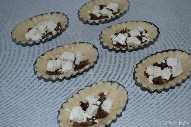 Adagiate sulla base delle tortine uno strato di cipolle Poi aggiungere un po' di feta sbriciolata
