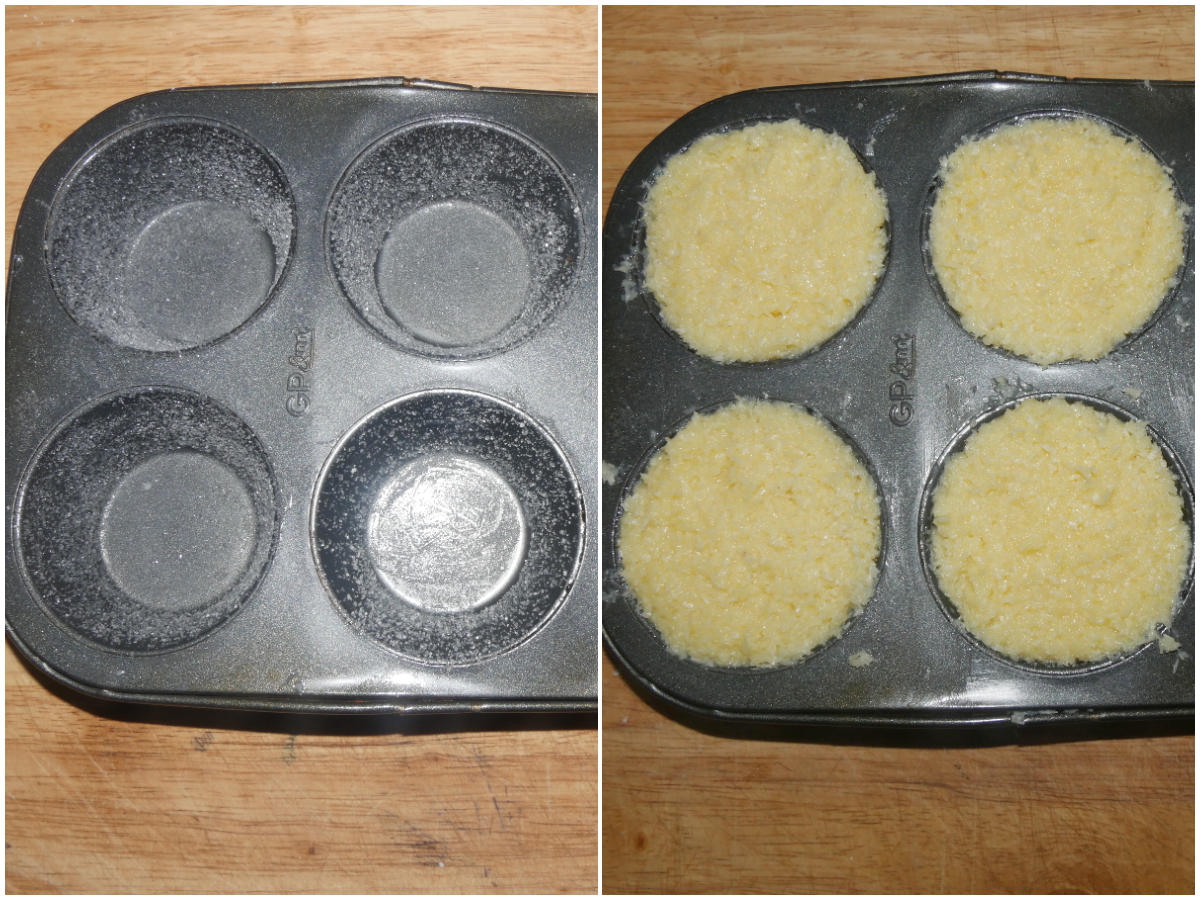 Imburrate e rivestite di zucchero (al posto della farina) degli stampioni per muffin, versate il composto all'interno e livellate la superficie.