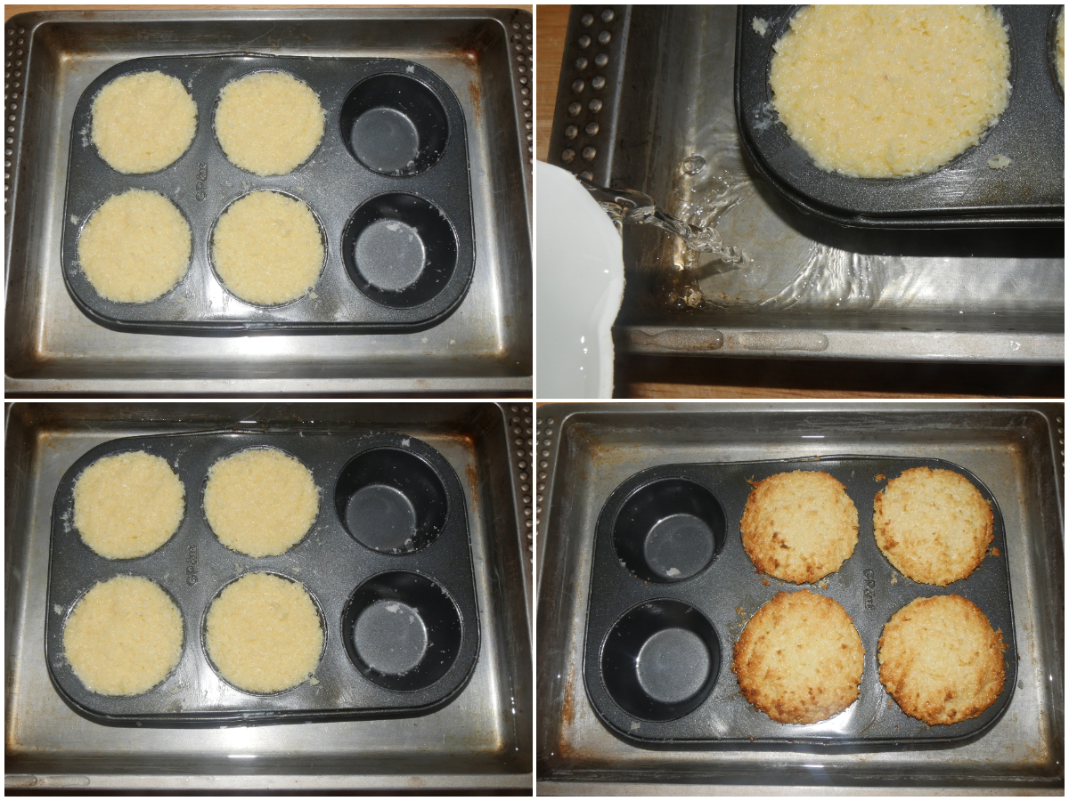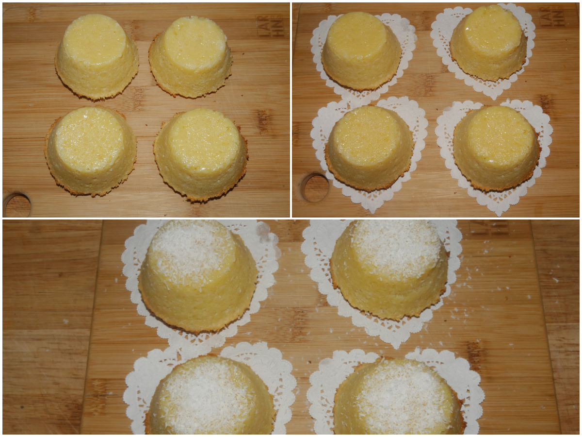 Mettete gli stampini in una pirofila o una teglia e aggiungete acqua fino a circa metà degli stampini (devono comunque poggiare sul fondo, senza galleggiare in giro), quindi cuocete in forno ventilato preriscaldato a 160°C, per 35 minuti o fino a leggera doratura.