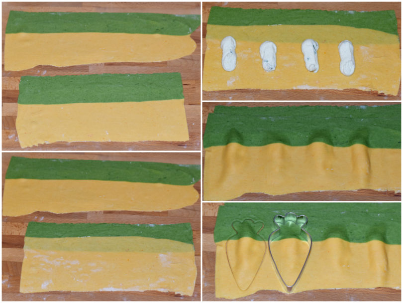 Aiutandovi con la sac-à-poche distribuite il ripieno sulla sfoglia bicolore, coprite con la seconda sfoglia e ritagliate con la formina apposita.
