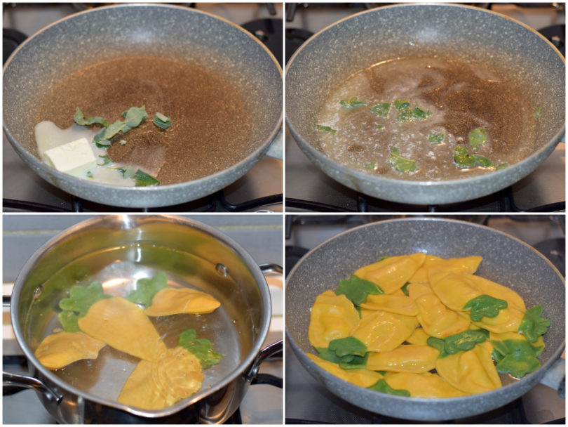 Io ho preparato un condimento con burro e salvia mentre cuocevo i ravioli in acqua bollente e leggermente salata.