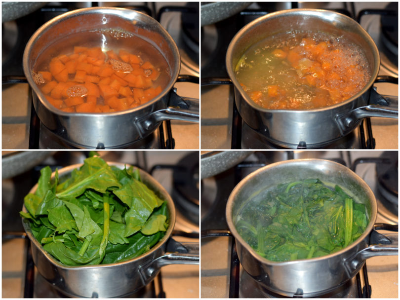 Lessate carote e spinaci separatamente, in acqua già bollente e leggermente salata: le carote per circa 10 minuti e gli spinaci per circa 5 minuti.