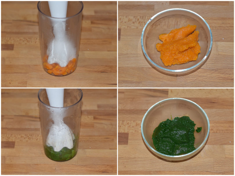 Sempre separatamente, frullate carote e spinaci con un minipimer oppure usando un mixer.