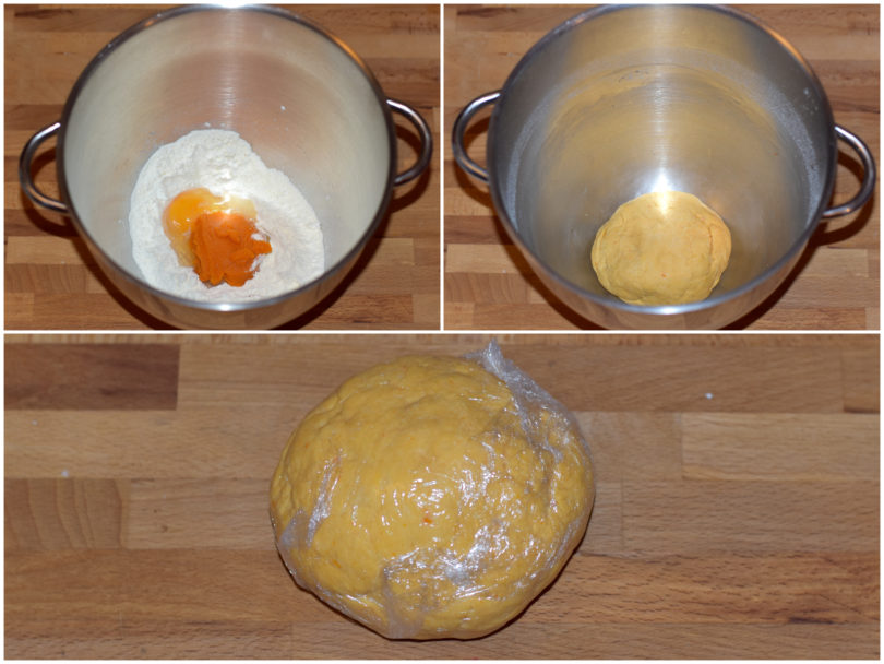 Preparate l'impasto alle carote: unite gli ingredienti in una ciotola e mescolate velocemente fino ad ottenere un panetto omogeneo, quindi avvolgetelo con pellicola per alimenti e lasciate riposare a temperatura ambiente per circa 30 minuti.