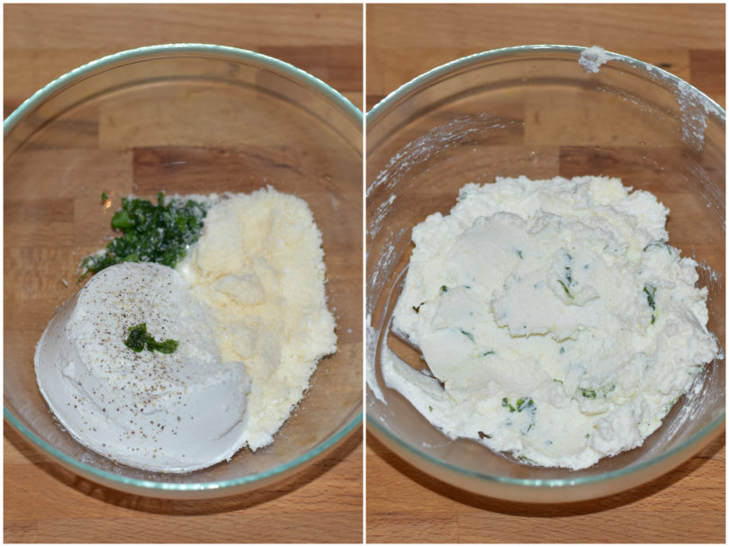 Mentre gli impasti riposano preparate il ripieno: unite gli ingredienti in una ciotola e amalgamate bene.