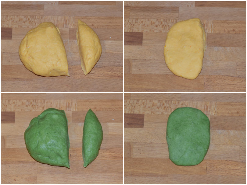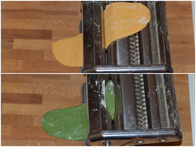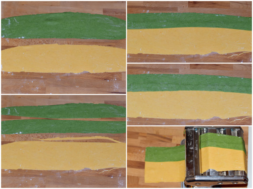 Unite quindi una sfoglia gialla e una verde: sovrapponetele leggermente tra di loro, tagliate via l'eccesso e ripassatele insieme nella macchinetta tirasfoglia.