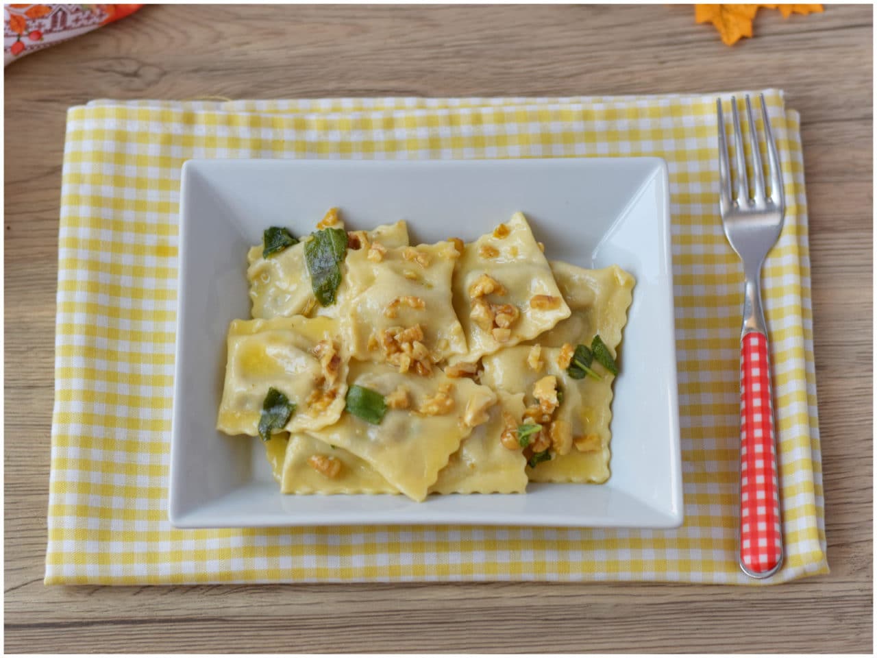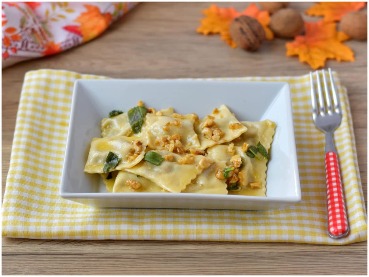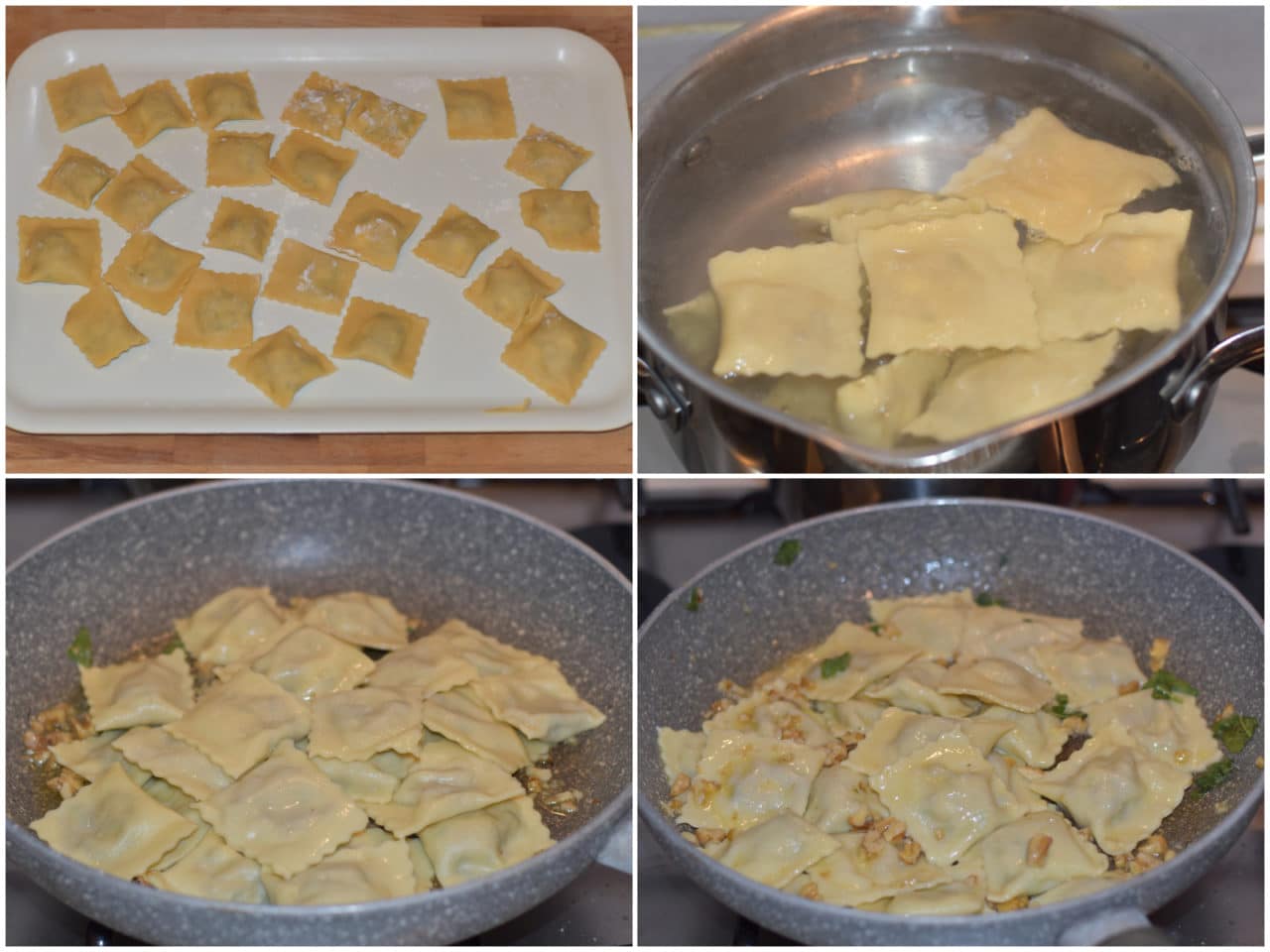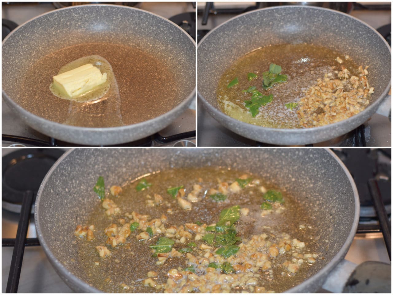 Mettete a bollire l'acqua per lessare i ravioli, leggermente salata, e intanto preparate il condimento: fate sciogliere il burro in un'ampia padella antiaderente e lasciateci insaporire le noci tritate grossolanamente insieme con la salvia spezzettata.