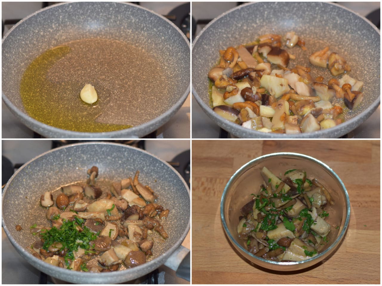 Fate scaldare l'olio in una padella con l'aglio, quindi aggiungete i funghi (se usate il misto surgelato, lasciatelo prima scongelare) e cuocete per 10 minuti a fiamma media, aggiungendo sale e prezzemolo verso fine cottura, quindi lasciateli raffreddare completamente.