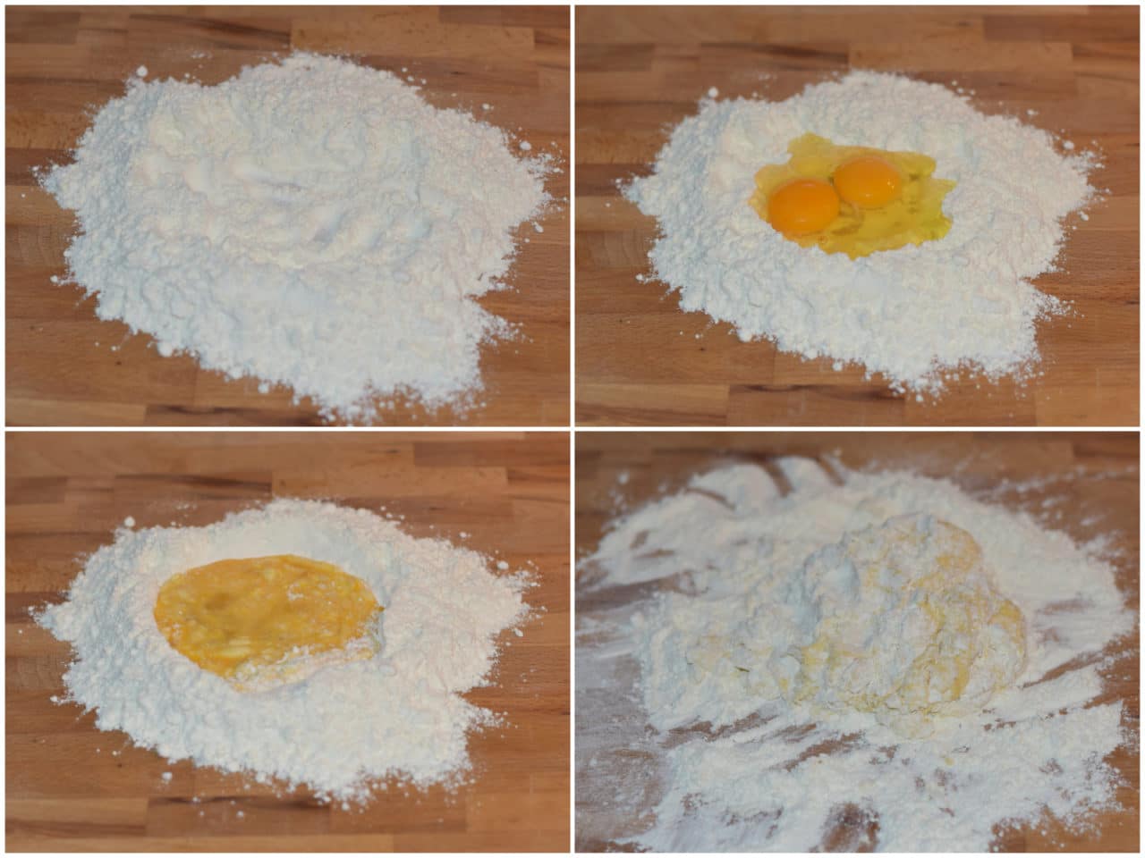 Nel frattempo preparate la pasta all'uovo: mettete la farina a fontana sul piano di lavoro ben pulito, unite al centro le uova e iniziate a mescolare con le dita o con una forchetta, iniziando a inglobare sempre più farina, fino ad ottenere un panetto omogeneo.