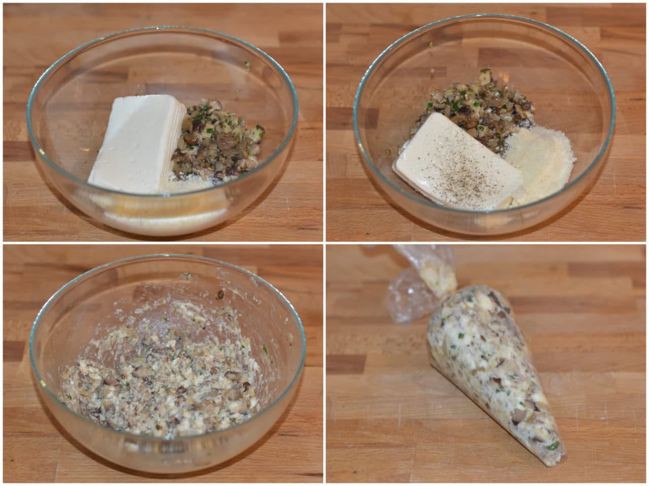 Tritate grossolanamente i funghi e amalgamateli con stracchino, pepe e grana, quindi trasferite il composto in una sac-à-poche (o potete lasciarlo nella ciotola e distribuirlo con un cucchiaino, se preferite).