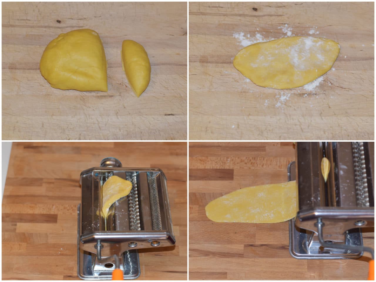 Riprendete la pasta, dividetela in pezzi e stendetela prima con le mani sul piano di lavoro leggermente infarinato e poi con la macchinetta tirasfoglia, partendo dallo spessore più grande e ripassandola poi più volte con spessore decrescente fino ad arrivare a quello più sottile.
