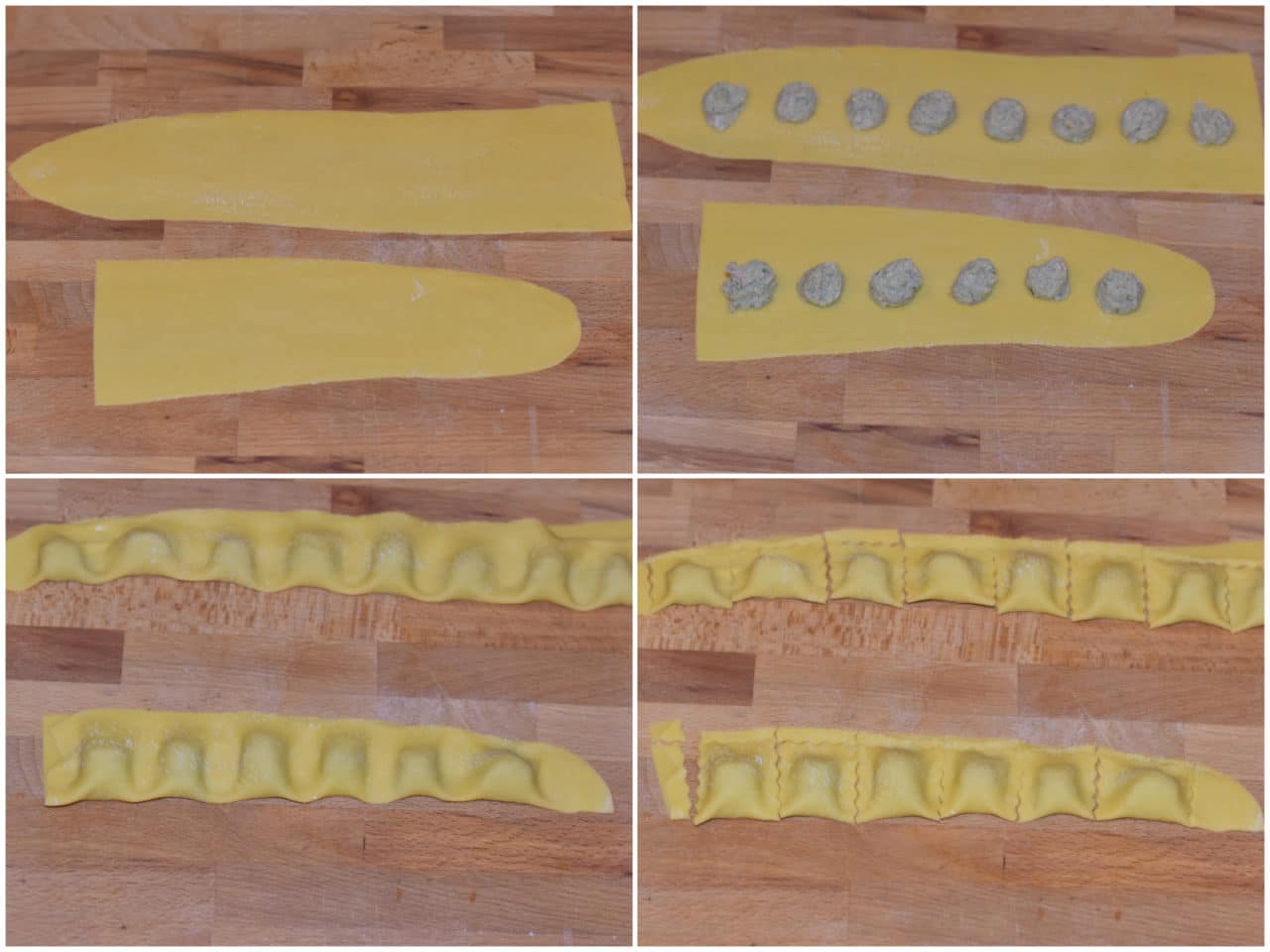Distribuite la farcitura di carne sulla sfoglia a intervalli regolari, quindi pizzicare con le dita di lato al ripieno e poi ritagliate i ravioli con la rotella zigrinata.
