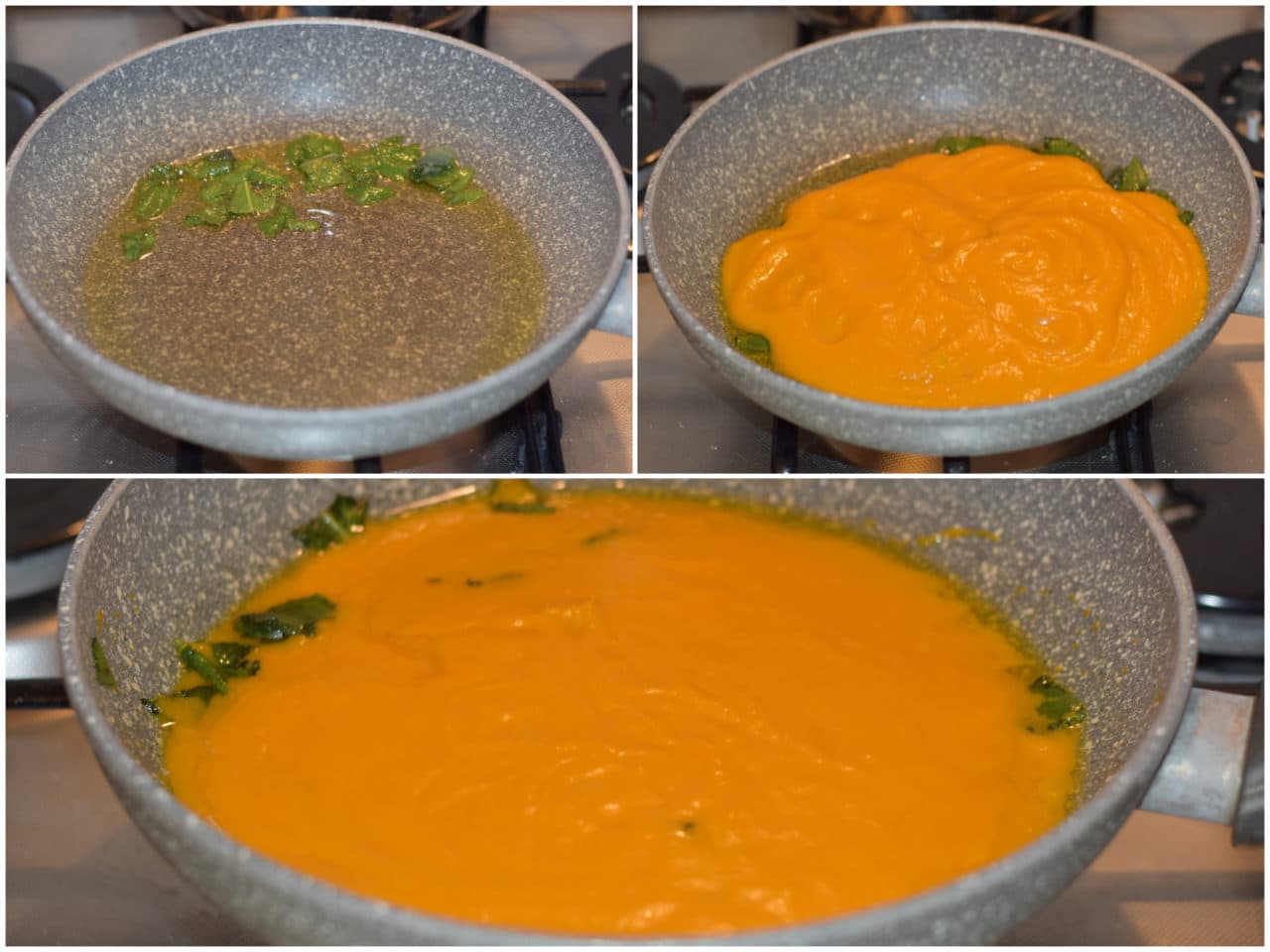 Fate scaldare dell'olio in una padella antiaderente con della salvia spezzettata, poi unite le verdure del brodo frullate che avevate messo da parte e lasciate insaporire e scaldare per qualche minuto.