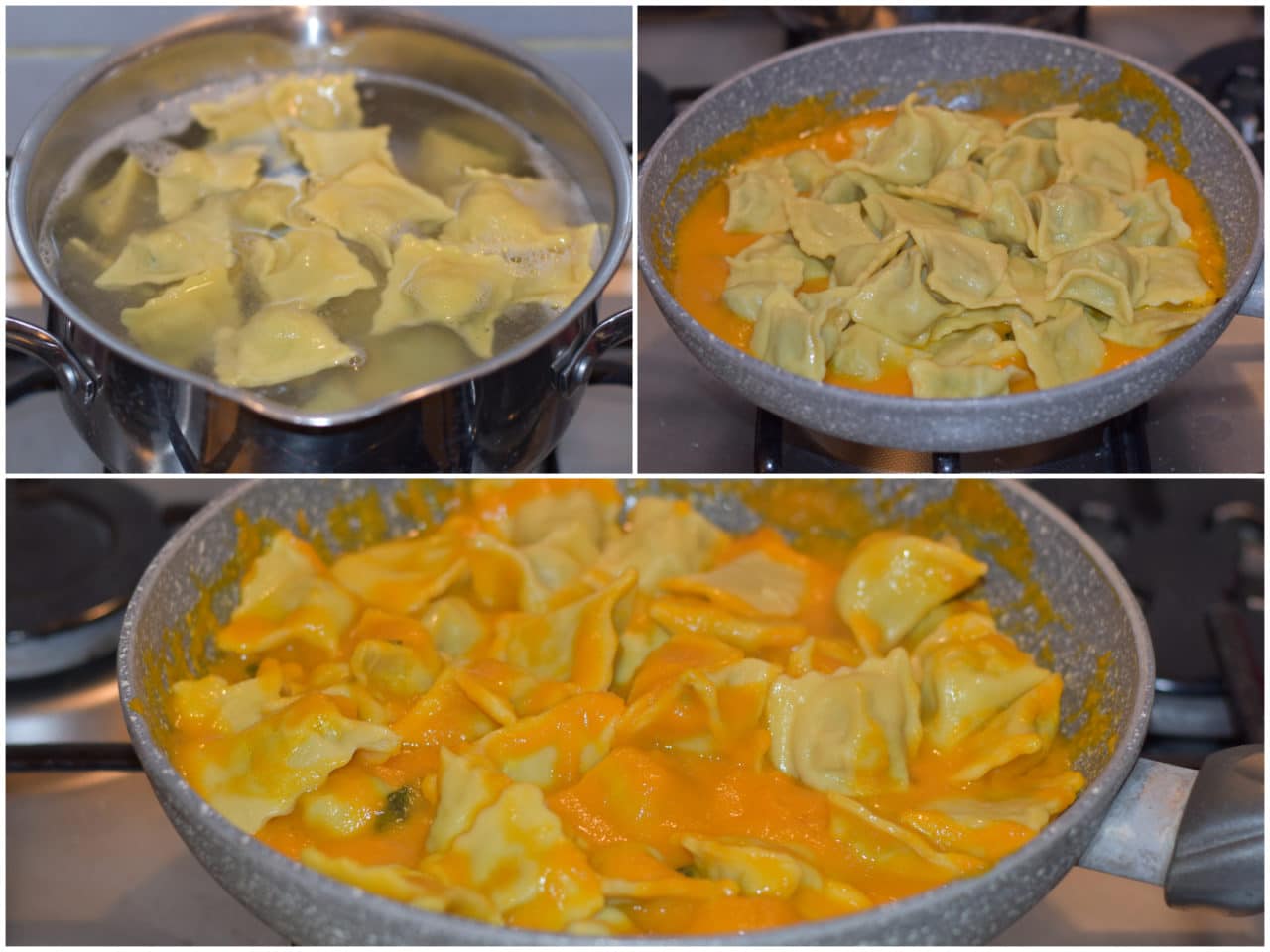 Lessate i ravioli per circa 5 minuti in abbondante acqua bollente leggermente salata, scolateli e aggiungeteli al condimento.