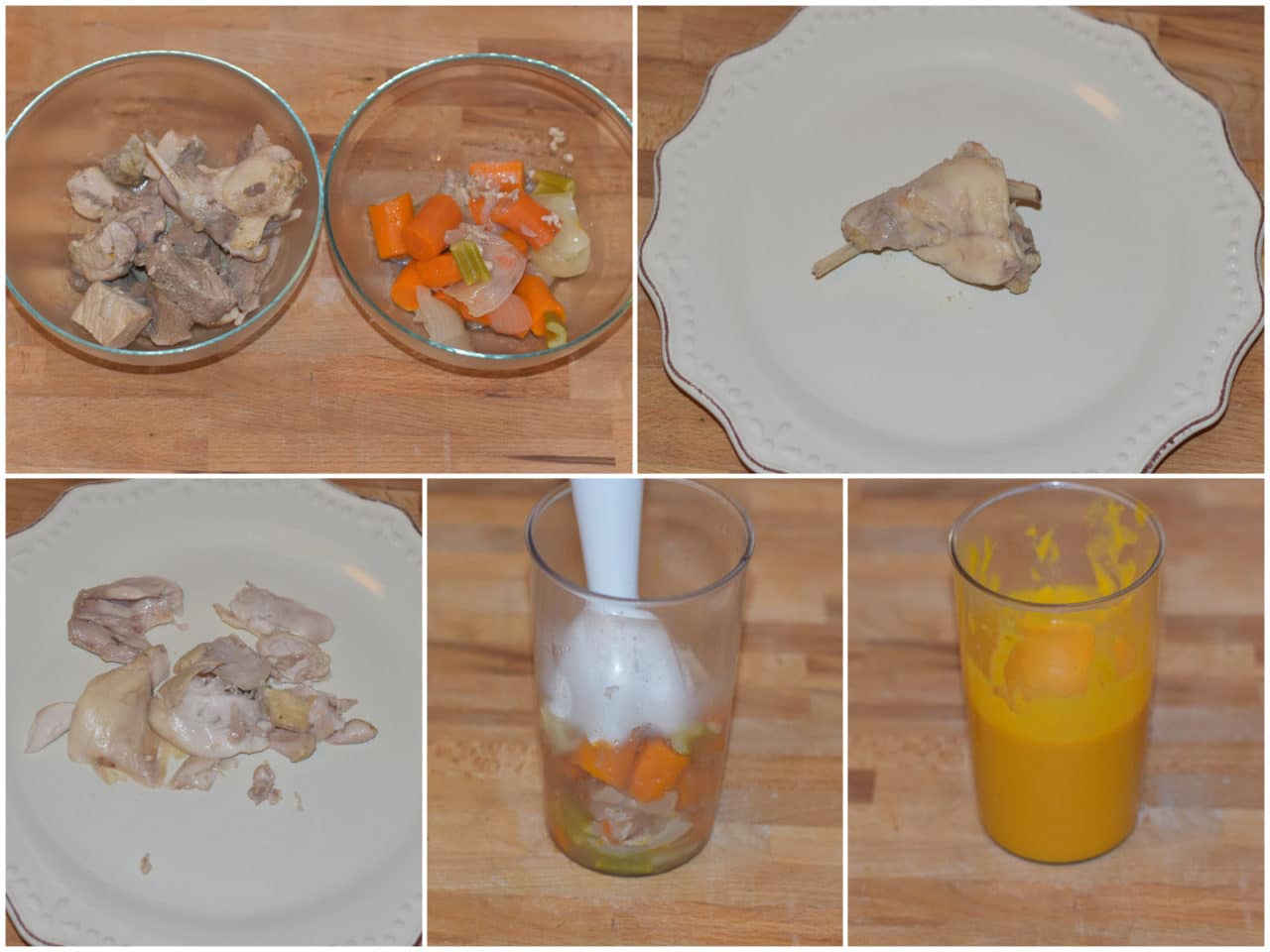 Una volta cotte, sollevate carne e verdure con una schiumarola, separatele, quindi disossate la prima e frullate le seconde, poi tenetele da parte.