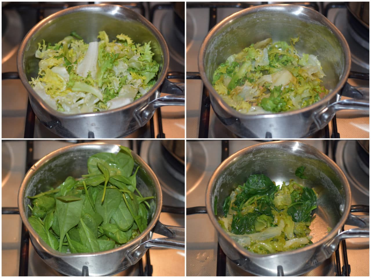 Mettete la scarola ben lavata in una pentola con un filo d'olio, senza aggiungere acqua, e lasciatela appassire con coperchio per un paio di minuti, poi unite anche gli spinaci e stufate ancora per 5 minuti.