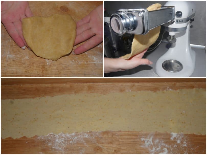 Tagliare la pasta in 4 parti e con la macchinetta apposita o un mattarello ricavare delle strisce dello spessore di 1 mm. infarinare la pasta ad ogni passaggio se risultasse appiccicosa.