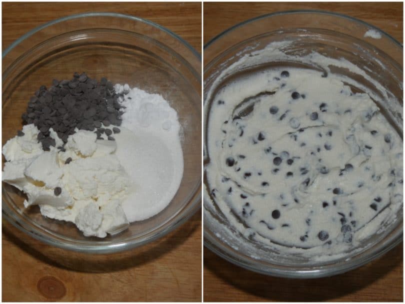 Preparate il ripieno dei ravioli mescolando in una ciotola la ricotta ( deve essere bella asciutta, meglio se è stata un giorno in frigo) con lo zucchero e le gocce di cioccolato