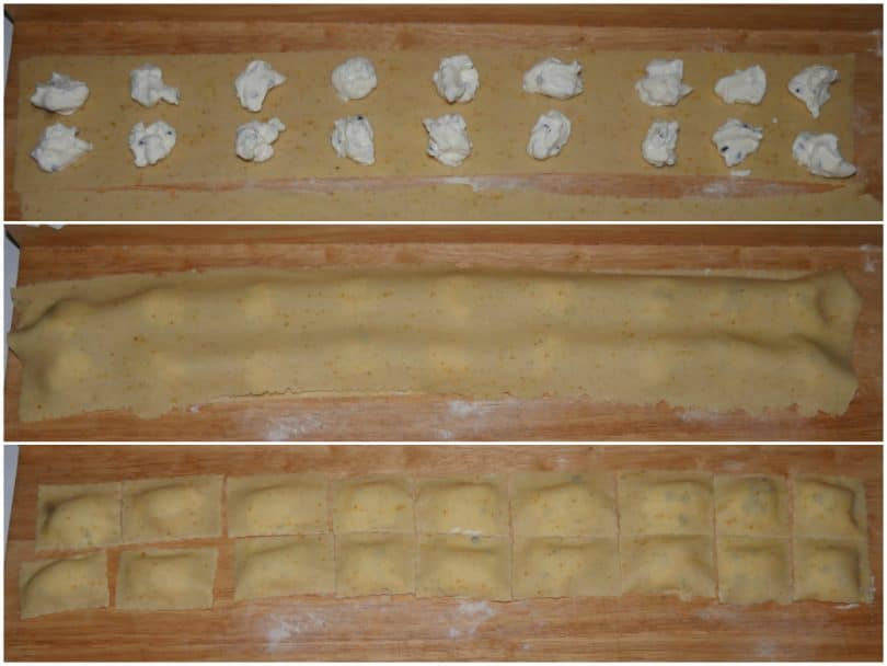 Adagiate la sfoglia ottenuta su di una spianatoia infarinata e disponete su di essa dei mucchietti di ripieno a distanza di qualche cm l'uno dall’altro. Ricoprite con un'altra sfoglia di pasta e con una rotellina tagliapasta ricavare dei ravioli, chiudendo bene per sigillare i bordi