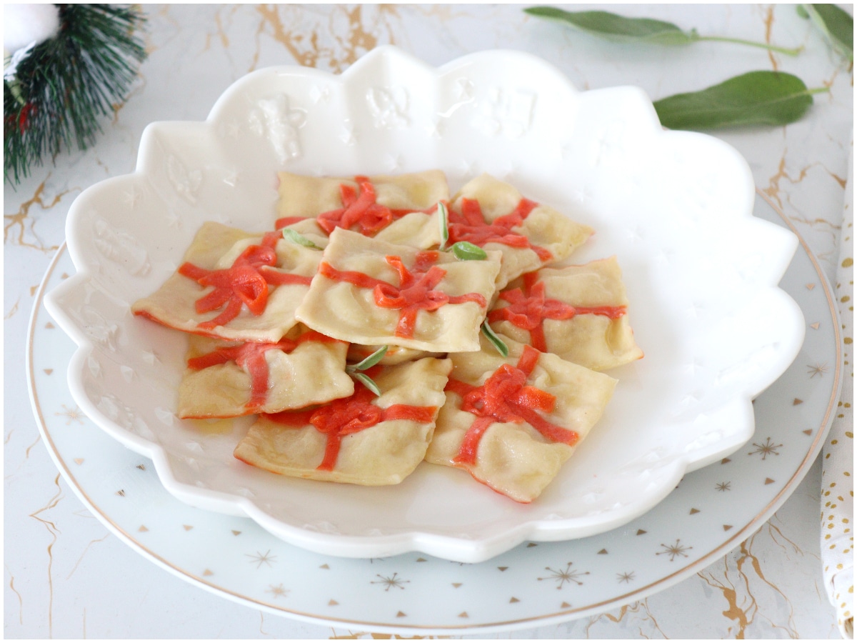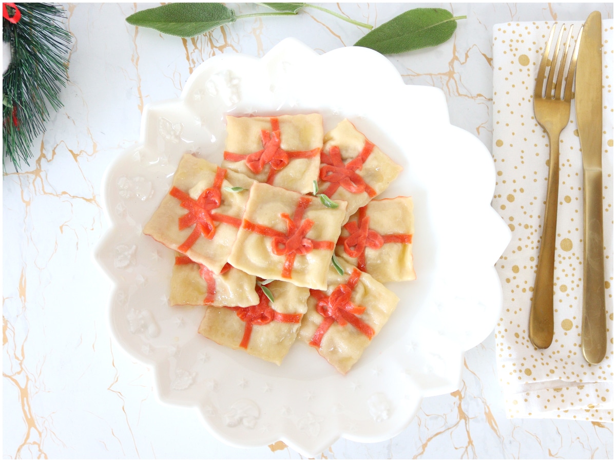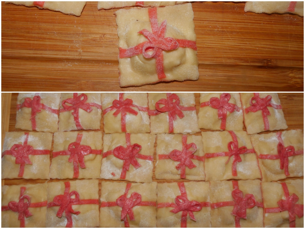 La ricetta per preparare i ravioli pacchetto regalo l'ho vista qui e l'ho trovata assolutamente sorprendente e deliziosa, perfetta per il periodo natalizio o magari per una festa di compleanno. Se avete un po' di dimestichezza con la pasta fresca fatta in casa sono sicura che non avrete problemi anche con questi ravioli, altrimenti armatevi di un po' di pazienza e cercate di fare del vostro meglio. Il procedimento in fondo non è troppo difficile, per quanto un pochino più elaborato della media quando si parla di ravioli: l'unico passaggio più complesso è l'aggiunta dei fiocchetti, ma spero che con le immagini che vi ho fornito non avrete troppi problemi. Io ho scelto un ripieno saporito a base di carne e stracchino, ma se preferite potete variarlo a piacere. Per quanto riguarda il condimento, io ho scelto un semplice burro e salvia per non coprire i colori della pasta, che devono restare, secondo me, i veri protagonisti del piatto... ma naturalmente sono aperta a suggerimenti: che condimenti alternativi suggerireste?