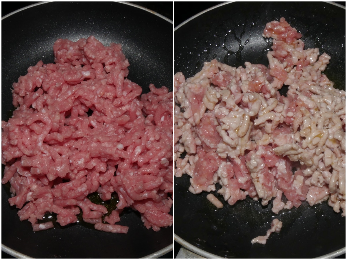 Nel frattempo preparate il ripieno: fate rosolare la carne macinata con poco olio in una padella antiaderente.
