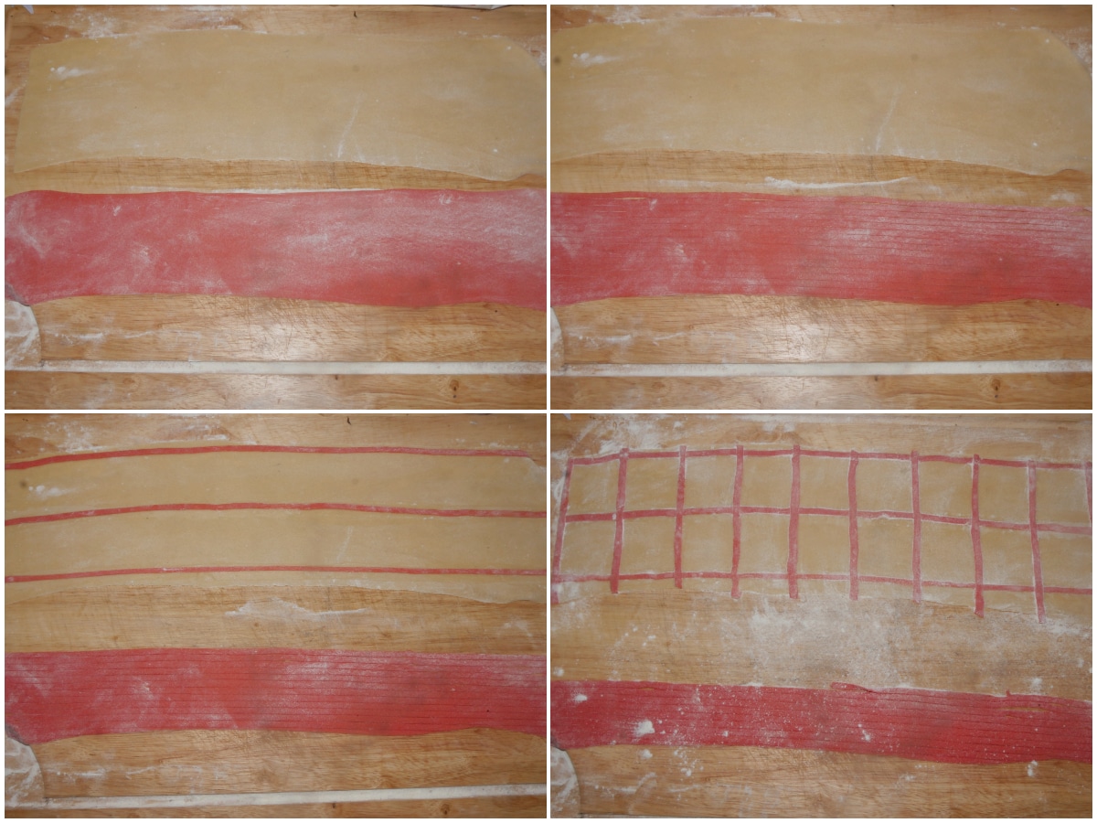 Con un po' di pazienza disponete i tagliolini rossi sulla sfoglia neutra per creare una sorta di griglia, quindi passate la sfoglia a righe nella macchinetta tirasfoglia per far attaccare bene i tagliolini e renderli un tutt'uno con la sfoglia gialla; in alternativa, aiutatevi con un pennellino piccolo (o un dito) leggermente bagnato di acqua per far aderire i tagliolini sulla sfoglia: ho fatto così per la seconda sfoglia epr farvi vedere entrambi i procedimenti.