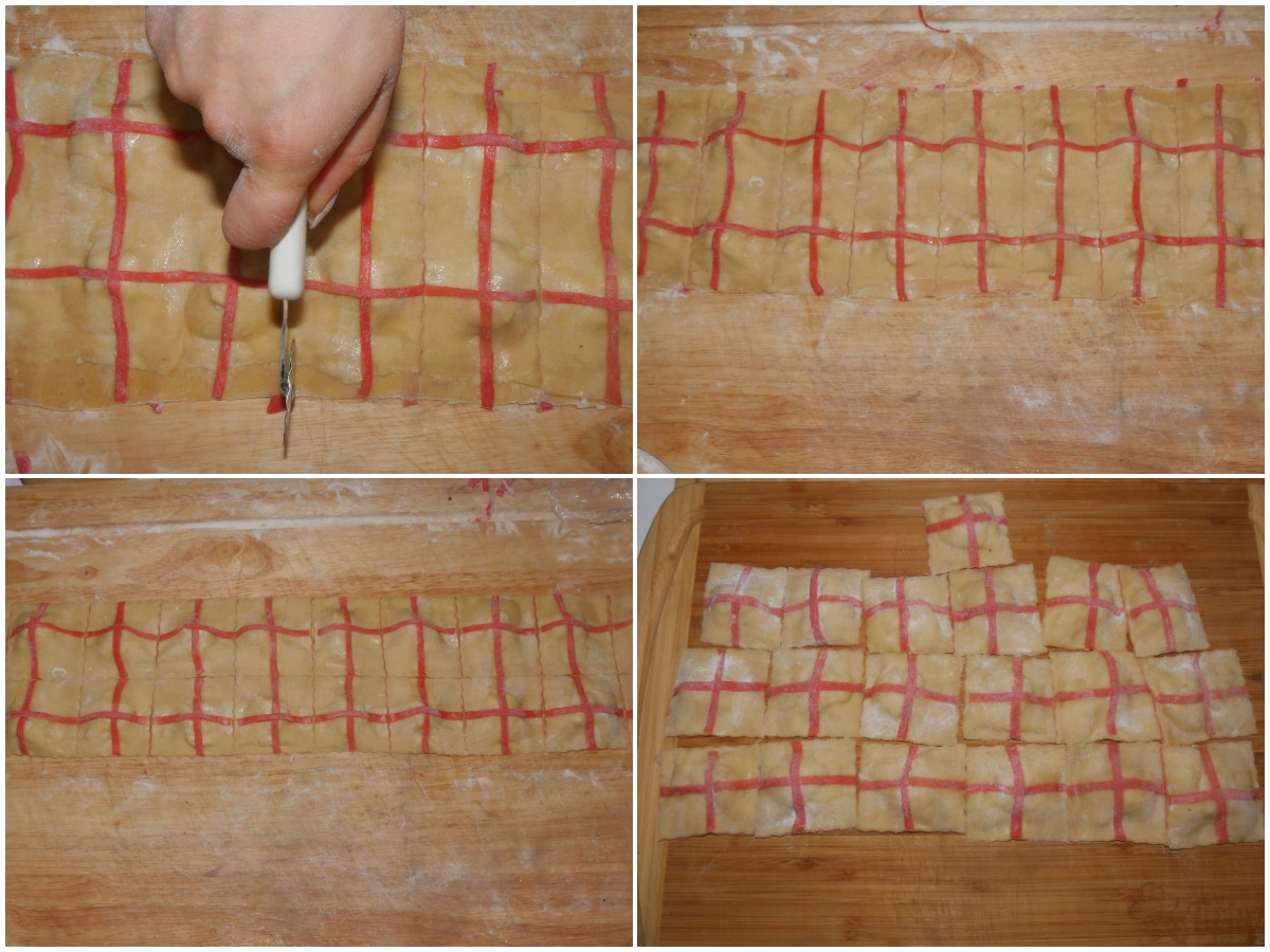 Aggiungete un cucchiaino di ripieno per ogni raviolo, cercando di poggiarlo sull'incrocio tra le strisce rosse, coprite con al seconda sfoglia premurandovi di far coincidere gli incroci tra le strisce proprio con il ripieno.
