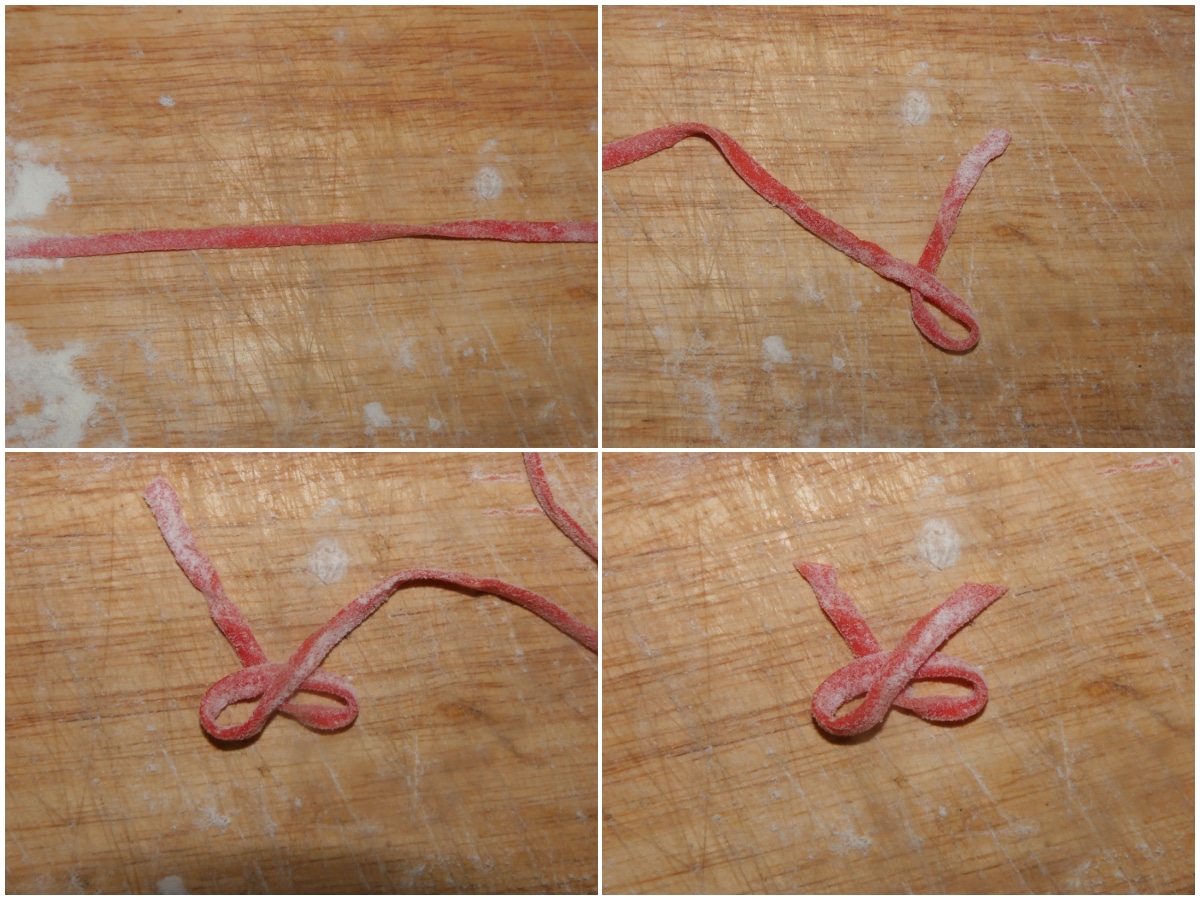 Preparate i fiocchetti con i tagliolini rossi avanzati: per ogni fiocchetto, create due piccoli anelli e incrociateli tra di loro, bagnando leggermente le superfici di contatto per farle attaccare tra di loro.