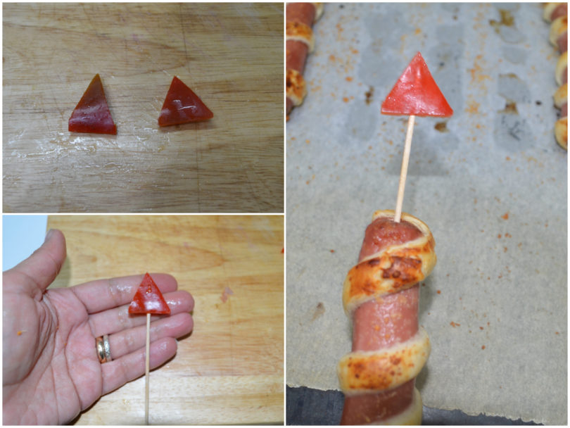 Lavate il peperone e pulitelo, quindi ricavatene 12 triangolini e infilzateli con uno stuzzicadenti e poi infilzate l'altro lato dello stuzzicadenti in cima ai wurstel, come vedete in foto.
