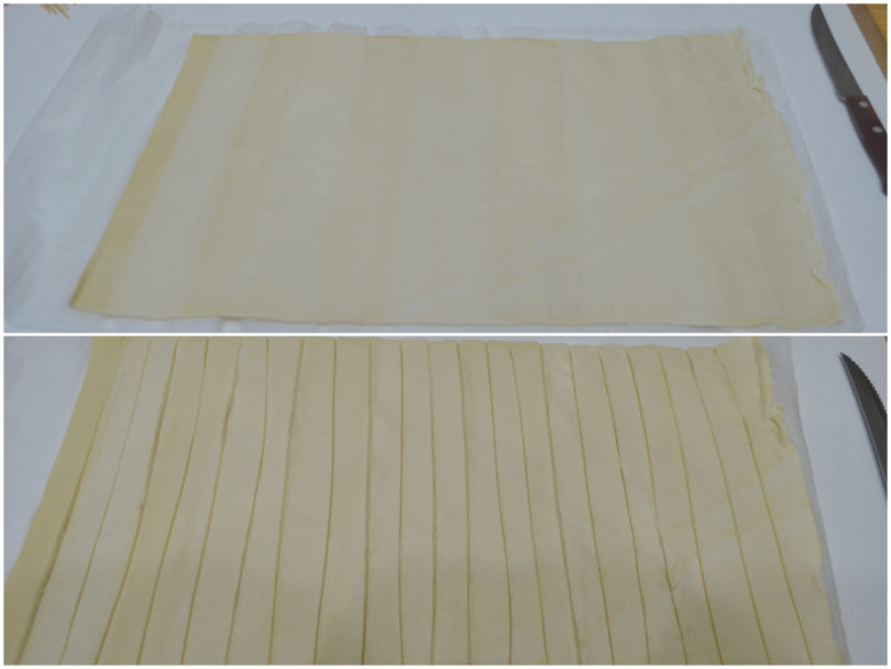 Innanzitutto tagliate la pasta sfoglia in striscioline sottili (1-2 cm).