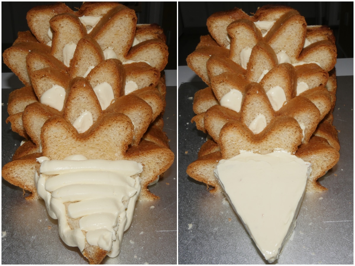 Appiattite un lato delle fette tagliandone via un po' (cercate di non fare le fette uguali, in modo da poterle sfalsare), quindi iniziate ad assemblare il dolce: mettete un po' di crema su di un vassoio, per non far scivolare via il pandoro, quindi iniziate a posizionare le fette, un po' sfalsate, unendole tra di loro con altra crema.