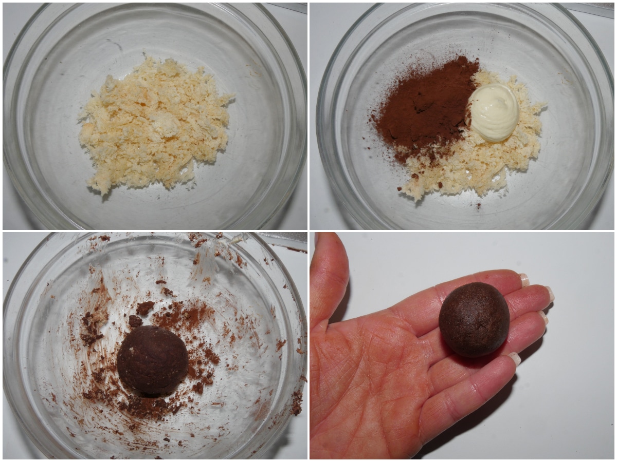 Per realizzare il naso ho creato 1 tartufino con resti di pandoro sbriciolato, crema al mascarpone e cacao.