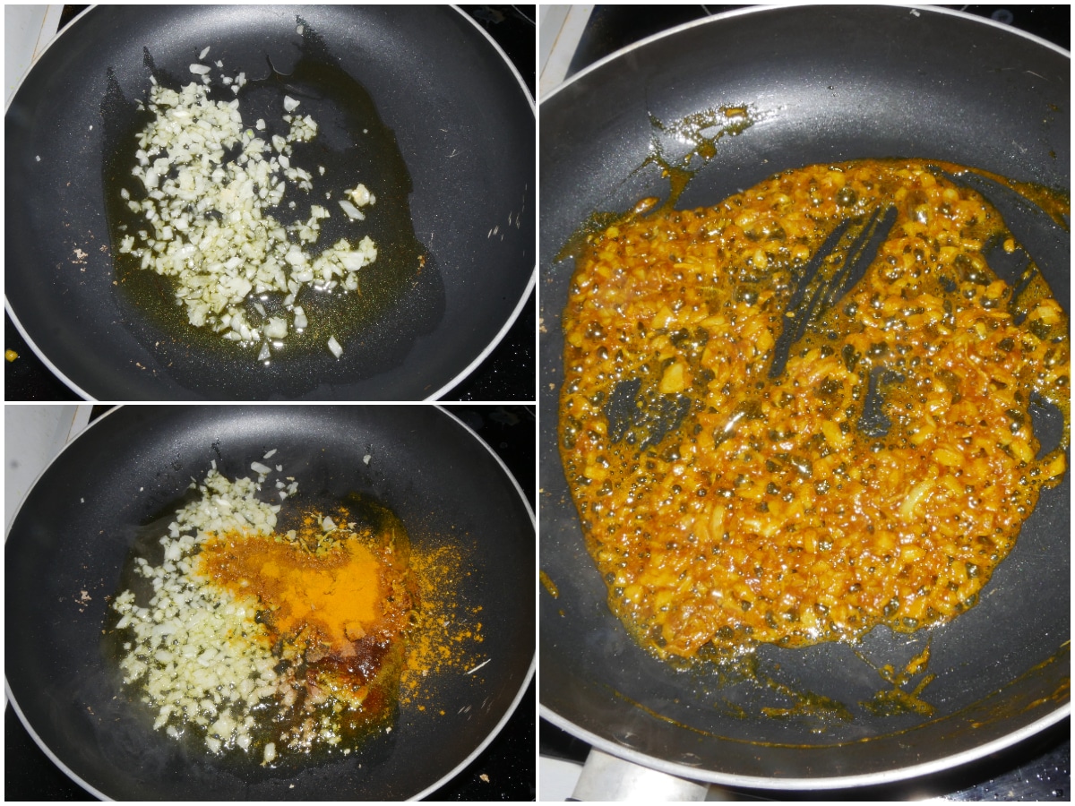 Tritate finemente la cipolla e fatela appassire leggermente con olio di cocco e di semi in una padella antiaderente, quindi unite le spezie (curry, curcuma, cumino, cannella e zenzero) e lasciate finire di appassire.